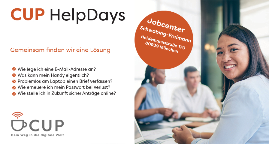 Wir freuen uns, dass Du Dich für die CUP HelpDays in München interessierst. CUP bietet an diesen Tagen allen Kunden*innen des Jobcenters München kostenlose Unterstützung bei digitalen Herausforderungen an. Gemeinsam lösen wir die von Dir gestellten Fragen im digitalen Bereich. Die Cup HelpDays finden jeweils an verschiedenen Orten in München statt. Bestimmt auch in Deiner Nähe. Wo wir demnächst sind, erfährst Du hier. Komm vorbei! Wir helfen Dir gerne.